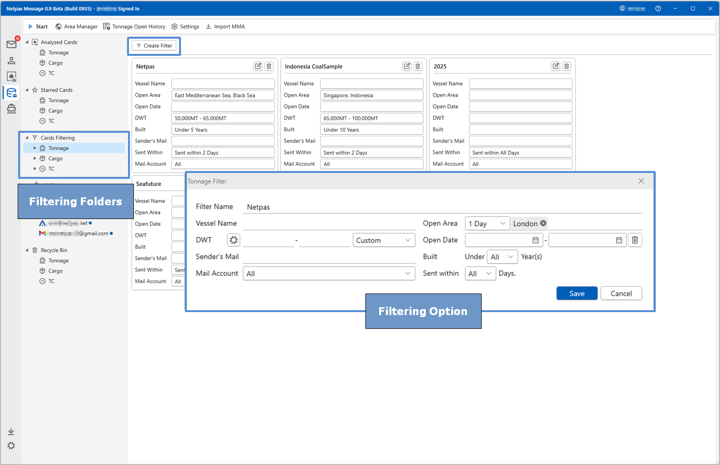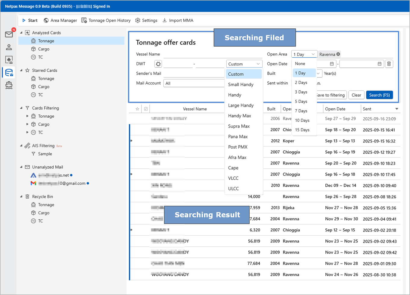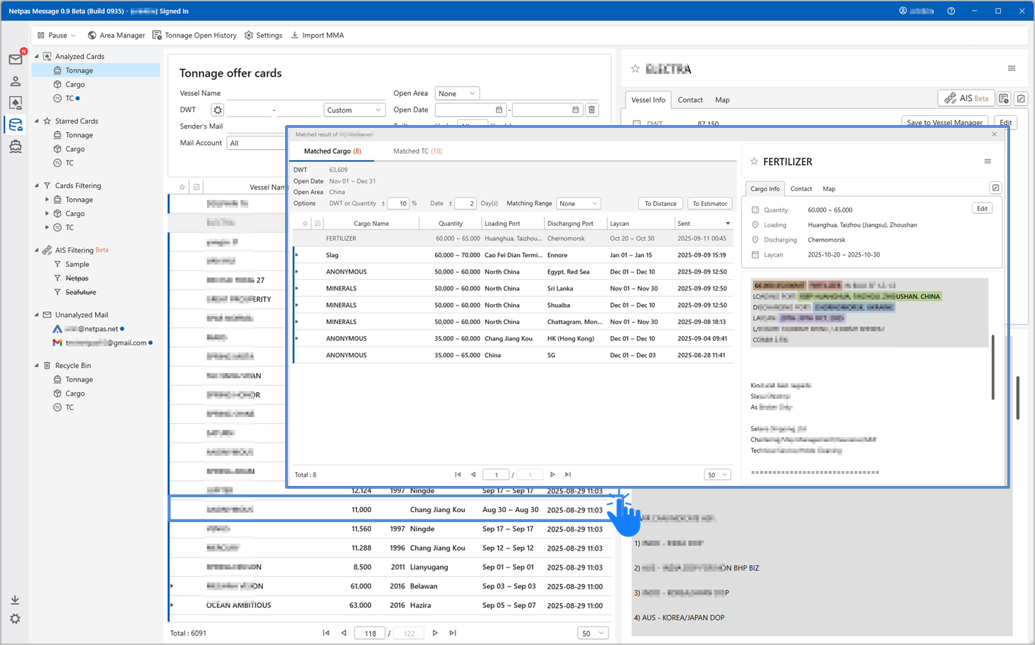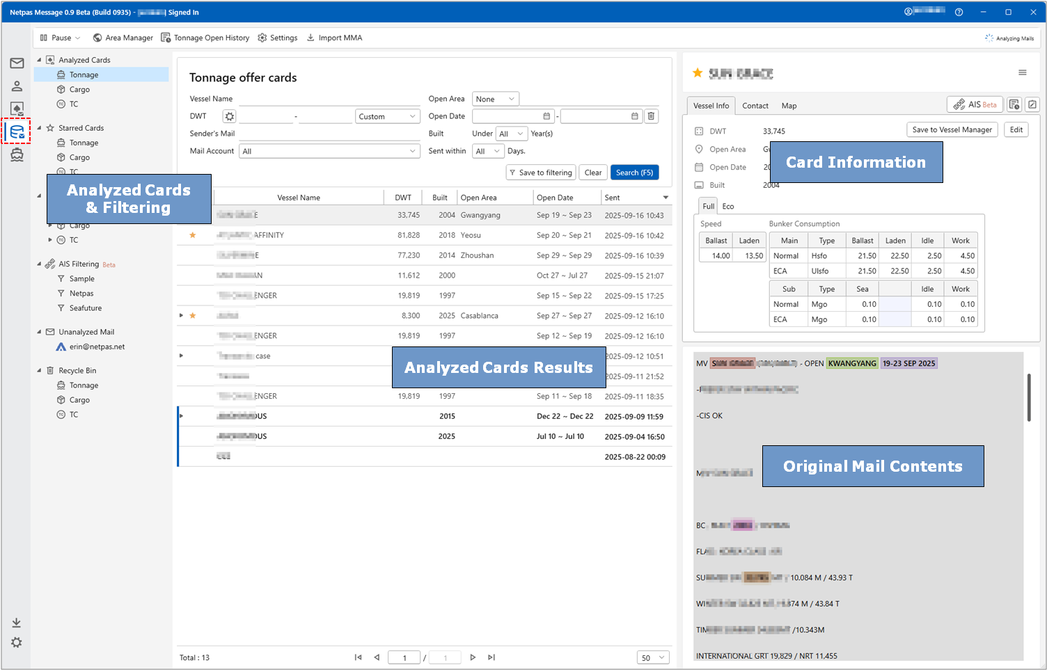 Netpas MMA collects your tonnage and cargo offer mails and analyze them to simple cards in database. This will provide you a quick and exact search of specific offers whenever you need.